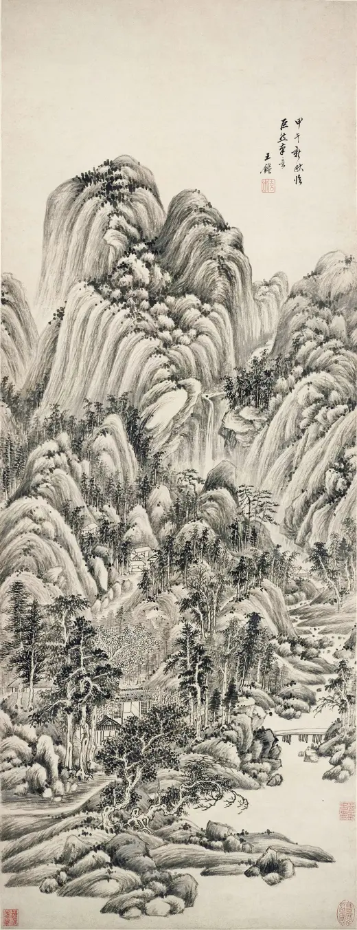 款识:甲寅(1674年)秋仲仿范华原笔似正翁年亲翁,王鉴。