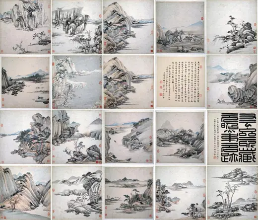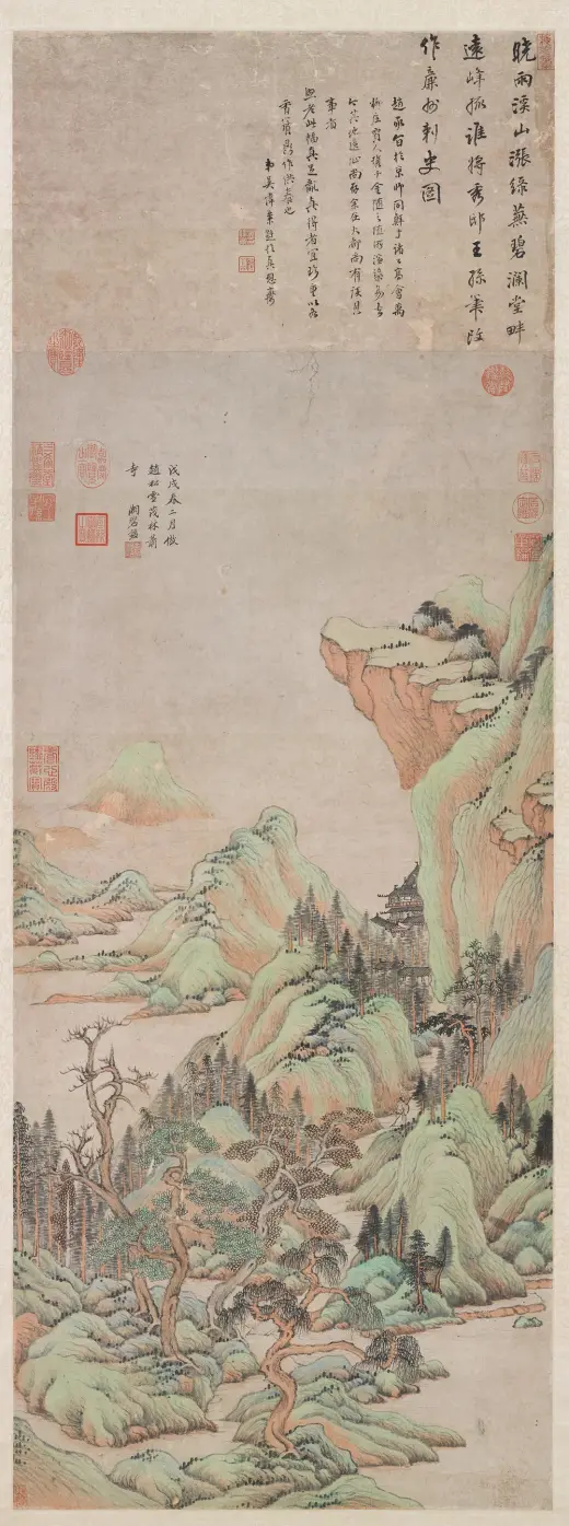 王鉴(一五九八-一六七七年),江苏太仓人,号湘碧。明代名士王世贞孙,山水与王时敏、王翚、王原祁并称清初四王。 四王深受明末董其昌画论影响,崇尚画史「南宗」。明中叶后仇英青绿山水画风盛行,王鉴另辟蹊径习赵孟頫青绿。自题:戊戌(一六五八年)春二月,仿赵松雪茂林萧寺。群山中一迳逶迤,高士策杖其间;岩豁梵宇,涧水石桥。笔墨秀丽,山脉走向带有动势。全幅典雅清丽。