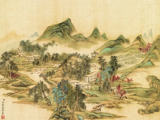 本幅采平远的布局法,画湖山村家,间杂以翠竹、桃花、杨柳,绿水相通,一片春景,引人入胜。