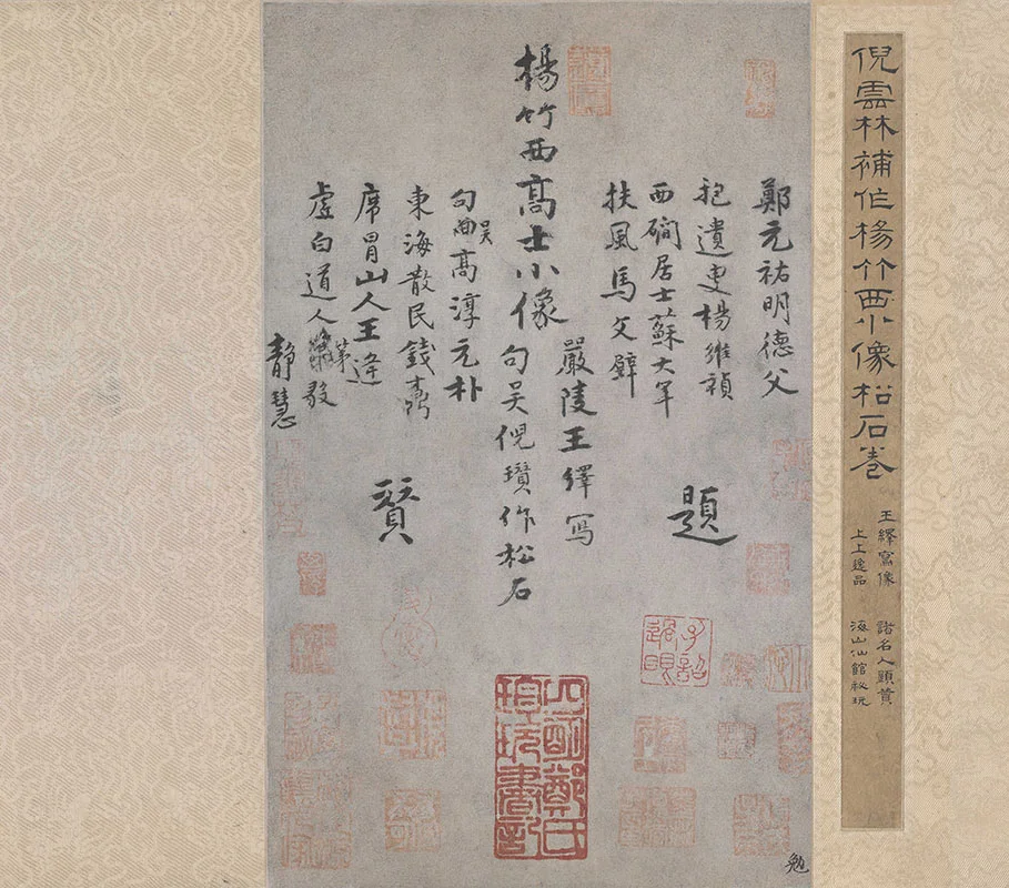 画中有倪瓒题云:“杨竹西高士小像,严陵王绎写,句吴倪瓒补作松石。癸卯二月。”卷后有元人邓元祜、杨维祯等十一家题记。钤名章、藏印等80余方。