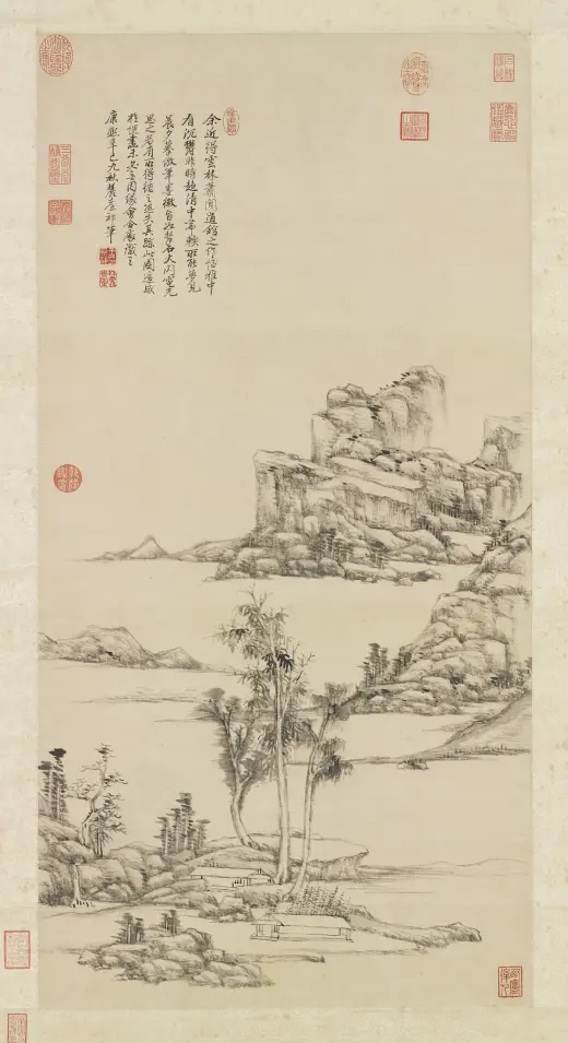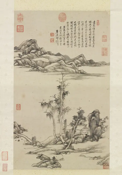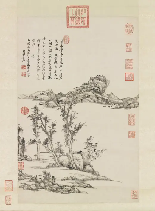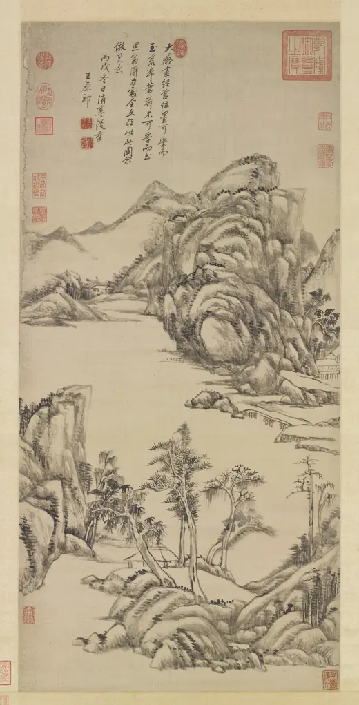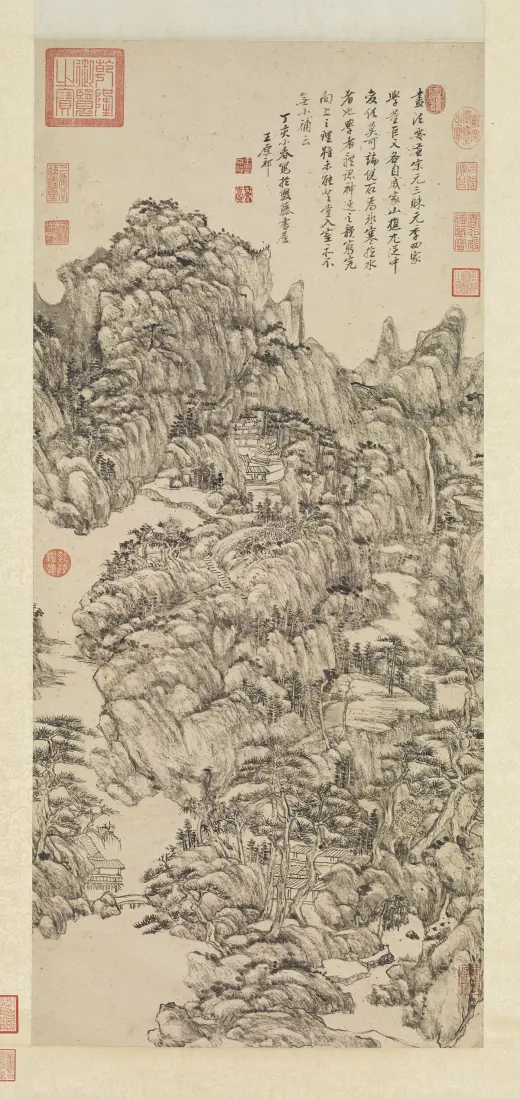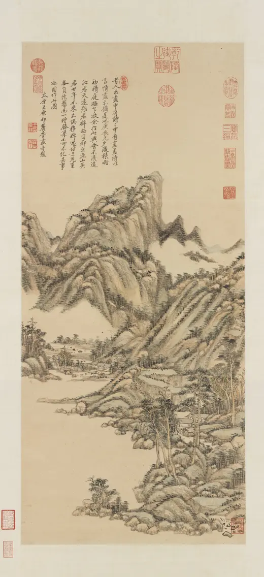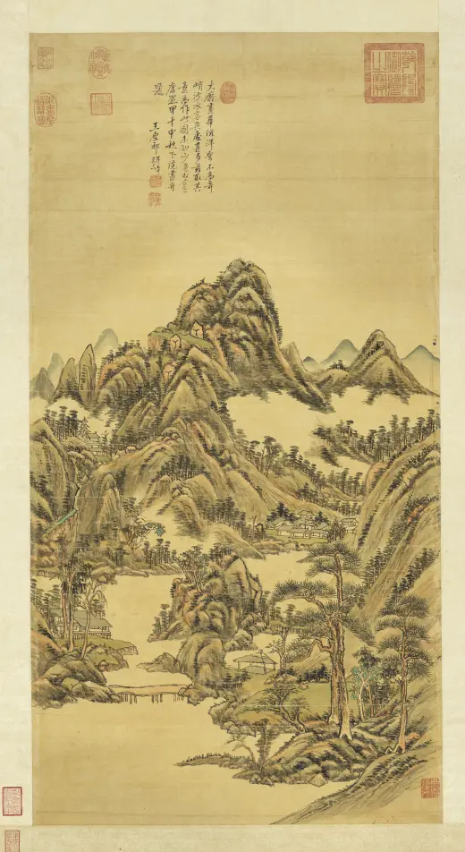 古人用笔。意在笔先。然妙处在藏锋不露。元之四家。化浑穆为萧洒。变刚劲为和柔。正藏锋之意也。子久尤得其要。可及可到处。正不可及不可到之处。个中三昧。在深参而自会之。康熙乙未(一七一五年)暮春。画于榖诒堂并题。王原祁。年七十有四。