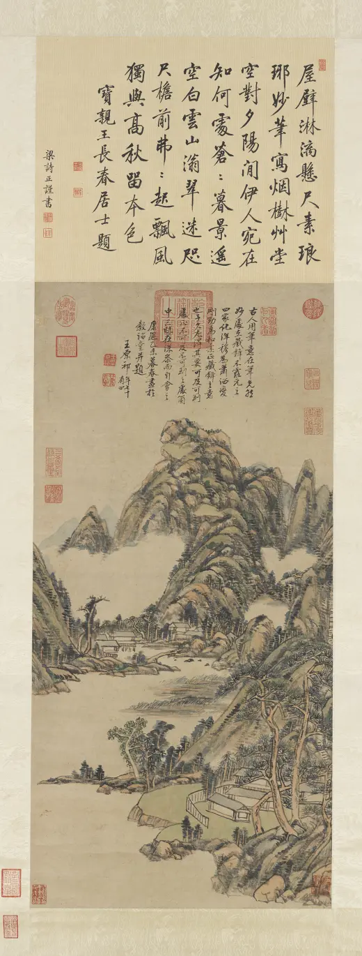 屋壁淋漓悬尺素。琅琊妙笔写烟树。草堂空对夕阳闲。伊人宛在知何处。苍苍暮景遥空白。云山滃翠迷咫尺。檐前弗弗起飘风。独与高秋留本色。宝亲王长春居士题。梁诗正谨书。