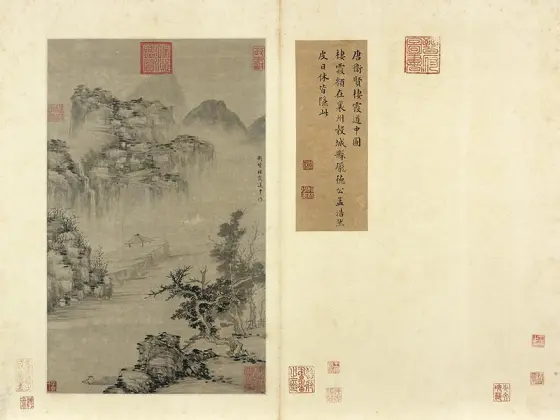该画作集山水、人物、建筑画为一体。以界画法描绘的屋舍准确、精细,山石及树木多用平笔密集皴擦,近树精心勾画,远树则勾点结合,重在以墨色由淡至深层层烘染,显得质感凝重,并能表现出一定的透视感和纵深关系。石凹处的浓墨千点,则为画家的独创手法。水流的勾线柔和顺畅,绵密有序,恰如微波皱起。
