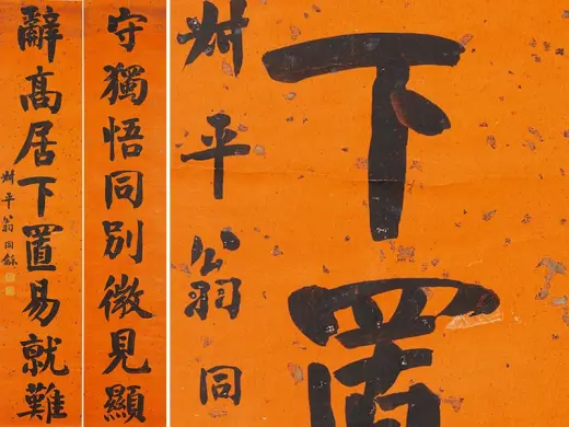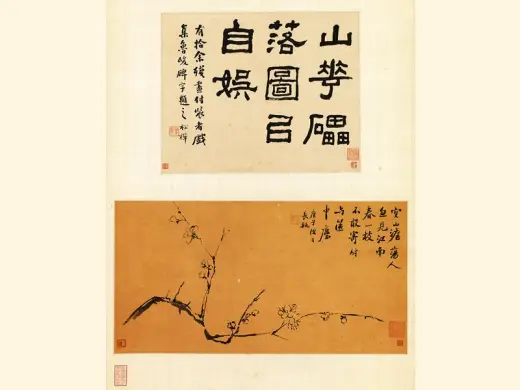 此为翁同龢书画自娱的作品,书和画各一幅,上下装裱的型式在轴中并不常见。前人曾说他间作山水木石及杂画,随意点染,古趣盎然,在此当可略窥端倪。下幅的一枝墨梅,笔简而有书法意趣,甚为古拙;上幅以隶书书「山华礧落图以自娱」句,用笔圆钝,其中带有楷书、篆书的意味,恰与画梅之笔相呼应。