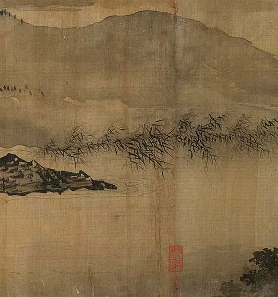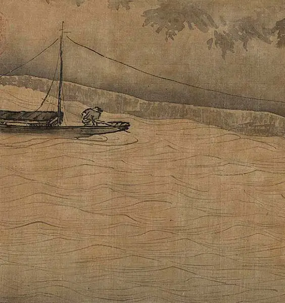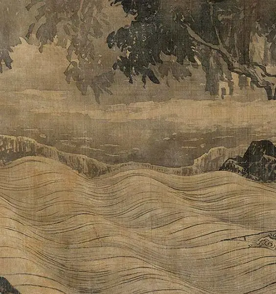 岸边村落里点缀着旅店、亭阁和寺庙,行人在陆地上匆匆赶路,为画卷增添了动感与生机。树木、岩石和人物的笔法遒劲,技法成熟。岩石与悬崖采用斧劈皴法,层次分明,气势磅礴,这些都是典型的明代浙派风格。传统上虽被视为南宋夏圭之作,但实际风格更符合明代特点,可能是后人临摹之作。