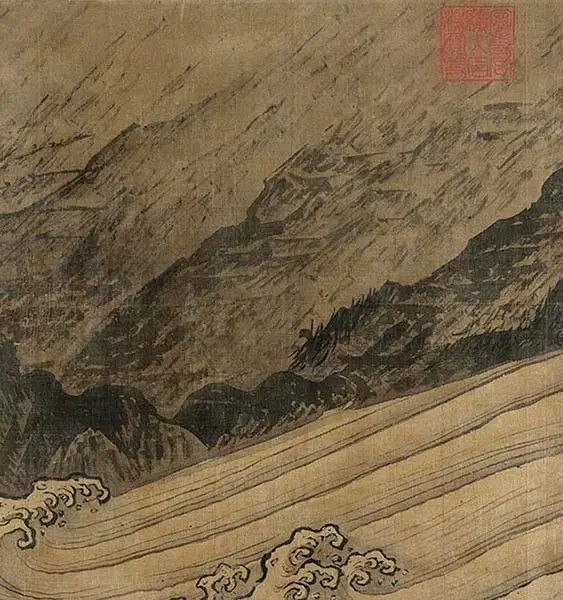 夏圭(字禹玉,钱塘人)活动于1195至1224年间,与马远齐名。他擅长山水和人物画,笔法成熟,常用水墨湿润技法。这幅窄幅手卷展示了奔腾的河水与飘浮远岸的奇幻景象,岩石岬角、幽静村庄和云雾缭绕的寺庙点缀其间,整体笔触充满活力,风格独特。