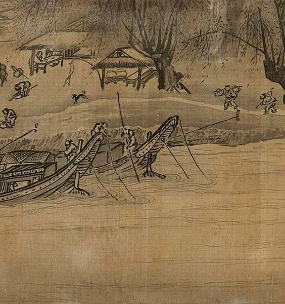 这幅手卷从右至左描绘了从波涛汹涌的上游到河口平静的景象。画面时而展现两岸峡谷险峻,江水奔流急窜的震撼场景,时而转入烟雾笼罩的开阔水域,展现出多变的水景。画中人物浮舟江上,有的勇敢逆流而上,有的则系缆岸边忙于装卸货物,生动体现了人们的生活场景。