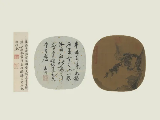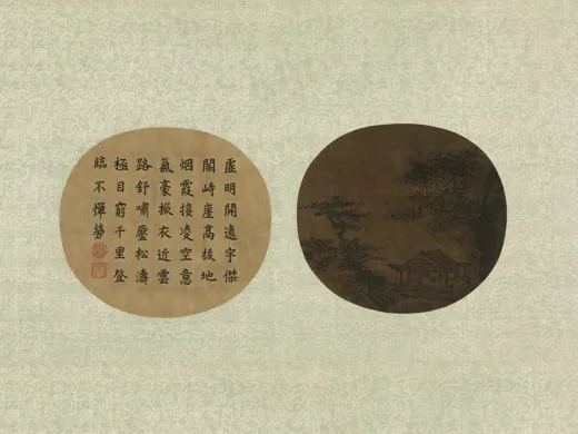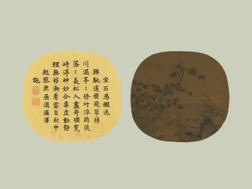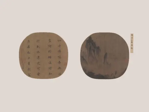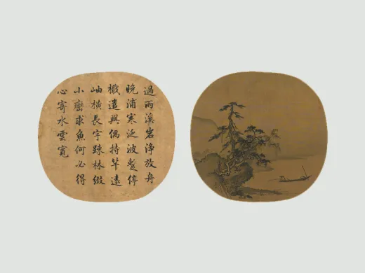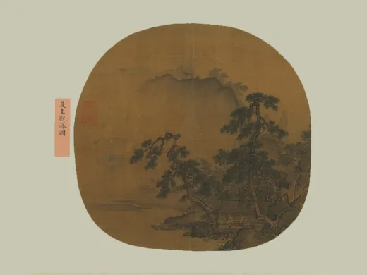 《泽畔疾风图》画的是青山绿水之间,一叶小舟正在离岸而去,岸上以人似刚从舟中上岸,小舟与岸上的人反向而行,营造出画面的延伸感。而树石之后的路和远山之间的云水,都在这动态的延伸之中被无形地刻画出来。