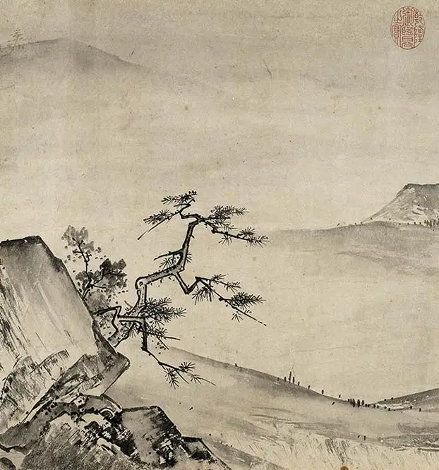 笔墨变化非常多,除了中松树林木外,画家还以大斧劈皴法(好似刀斧砍劈的笔触),来表现山石刚硬的质感,又以干枯的笔墨勾画石壁轮廓,再用夹杂著大量水分的笔墨迅速化开,产生水墨交融的画面效果,真是淋漓畅快。