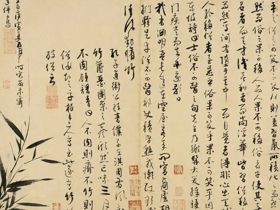 東坡先生有詩云。老可曾為竹寫真小坡(東坡子邁)。今與石傳神。至正己丑間。有客自天申來。持小坡竹石為余觀。得見真蹟。因誦簡齋詩云。意足不求顏色似。前身相馬九方臯。書至此。陡覺意趣似有所得。夫畫竹之法。當先師意。然後以筆法求之。可也。倘得意在筆前。則所作有天趣自然之妙。如其泥於筆法。求其形似者。豈可同日語耶。因作此紙。為佛奴寶之。吾老矣。惜其所學欠精。後生者當有精力之時。飽食終日。無所用心。略親于研池。遊戲。終勝別用心。亦不可終焉溺于此。但能玩而不流。斯可矣。至正庚寅夏五月一日。梅華人戲墨于醉李春波陋室。
