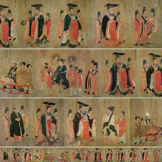 “职贡图”这个题材有两类,一类以描绘各方来朝使节图像为主的表现方法,从此成为历代《职贡图》的基本形式之一,代表作是萧绎《职贡图》。与之相对,在另一类《职贡图》中,画家并不对使节的服装样貌做出精细描绘,而是着重凸显朝贡队伍的壮观和所献贡品的珍奇,开创这一类型风格的据传为唐朝阎立本所绘的《职贡图》。