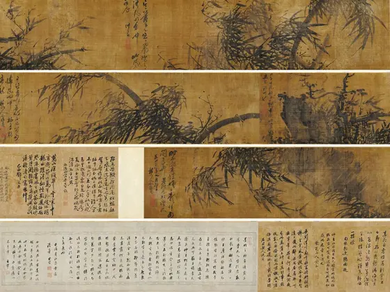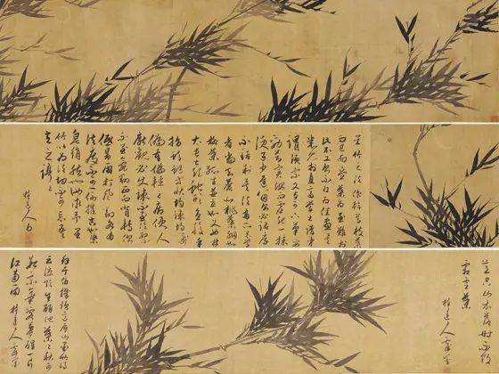 釋文:墨竹之法。公家有息齋李學士行世竹譜。備言其詳。豈在山野贅辭。但欲以墨跡摹其彷彿。息齋譜中。亦言宗文洋州之趣。蓋文竹近處絕為稀少。倘遇好事家出示。多贋欠真。所(所字疑誤)令學人慕而不堅。所以異其筆法也。與可之竹。大概出於自然。不求形似。與世畫工略不相入。但傳與可之名。不見真跡者多。縱遇真蹟。又涉狐疑臆度。賞會之家。如胸中流出。則易於驗辨。如其以他日(點去)人議論。徒為喋喋評詳。貽笑于大方之家多矣。余之謬言亦多矣。但公力入筆研。文字之餘。久久學純熟。與筆墨兩忘。自然見文洋州之趣。元不費力也。至正八年戊子(一三四八年)秋九月。梅華老朽戲墨而書。