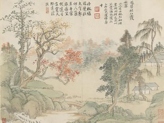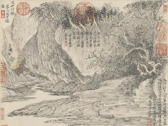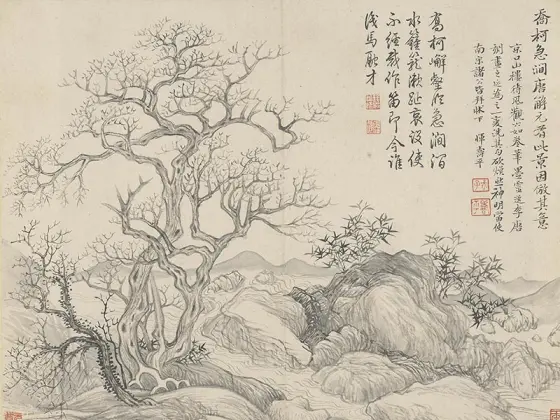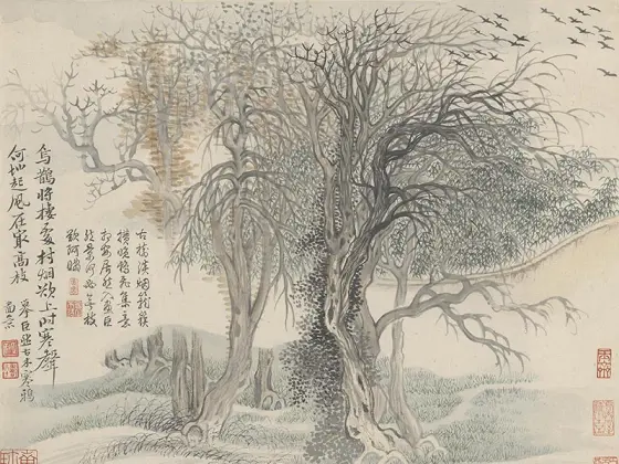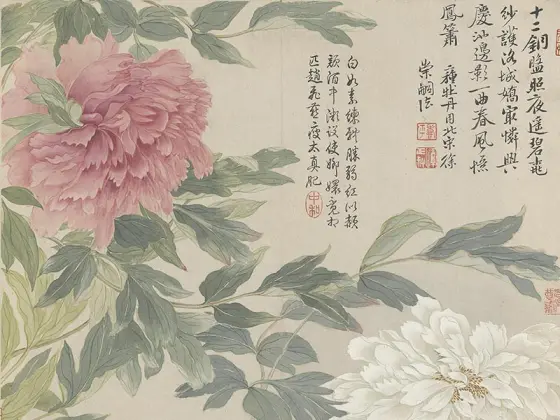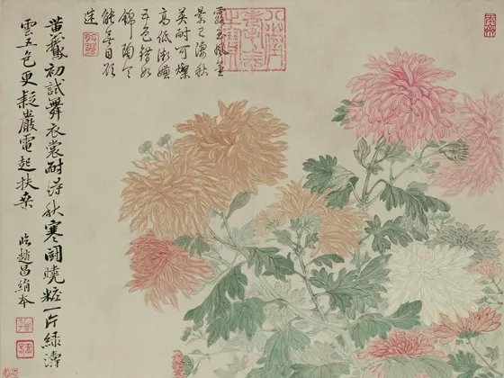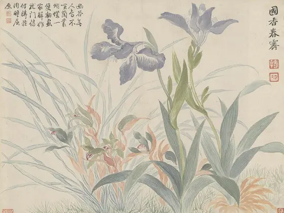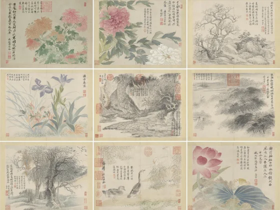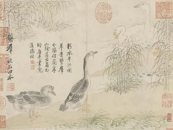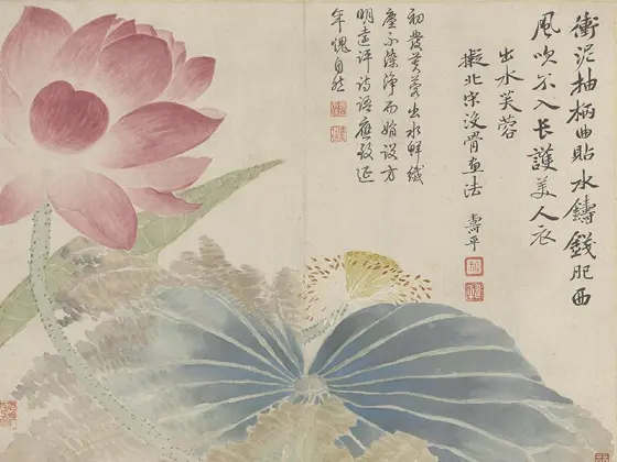 清恽寿平《山水花卉图册》分别描绘鹅群、荷花、山水、古木寒鸦、牡丹、乔柯急涧、夜雨初霁、菊花、兰花蝴蝶花、溪山行旅等。全册为作者临仿宋、元、明诸家。山水以宗董源、巨然、米芾、赵孟頫诸家为主,秀骨清幽,富有文人书卷之气。花鸟以宗徐崇嗣、赵昌、沈周诸家为主,重视写生,力求形似,如第五开的牡丹,技法灵活,宗法徐崇嗣的没骨法,同时又强调“与花传神”,力去华靡,追求“澹雅”,不刻意求工,唯求自然天趣,揭示出恽寿平一向所追求的平淡超逸的审美意趣。