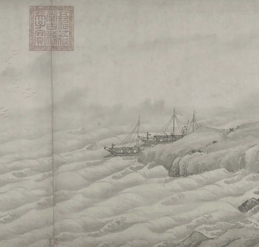 赵芾为南宋画家,京口(今江苏镇江)人,生卒年不详。《江山万里图》卷是赵芾唯一存世作品,从绘画技法可见,他是师从宋代画家李唐(约一○四九至一一三○年),对水的描绘占画面较大比例,波浪以淡墨勾出为主,再用淡墨染深,惊涛穿空之势跃然纸上;山石先用淡墨勾皴,复以浓墨、重墨细绘局部轮廓,墨色浓淡轻重相得益彰。