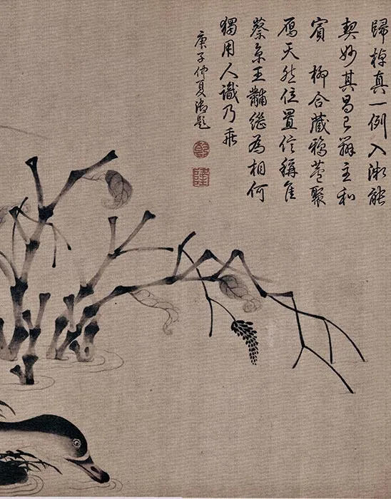 《柳鸦芦雁图》共分二段,前段画一株柳树和数只白头鸦。柳树枝干用粗笔浓墨作短条皴写,笔势很壮,显得浑朴拙厚,凹凸节宽之状自然天成。柳条直线下垂,流利畅达,运笔圆润健韧而富弹性,墨色前后层次分明。停在枝上的白头鸦或靠根偎依,静观自得,或喃喃相语,使寂静的大地充满了生机。鸟身用浓墨,黝黑如漆。鸟的羽毛用墨留出白线,鸟的嘴舌用淡红色点染,头和腹部敷以白粉,周围略用淡墨烘染,把白头鸦衬托得分外突出,显得神采奕奕。全图笔墨醇和安谧,脱去凡格,深得熙落墨之意韵。