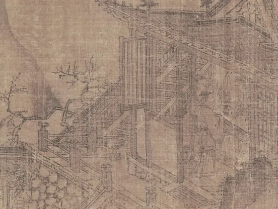 本图描写出李白所写的《蜀道难》这首诗的情景。画面上山路逶迤而上,山峰陡峭险峻,画家的笔下描写出了大自然的鬼斧神工,人们克服艰难困苦拾级而上,虽山路险峻,但一路景色优美。