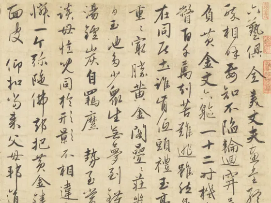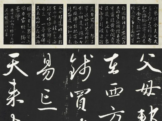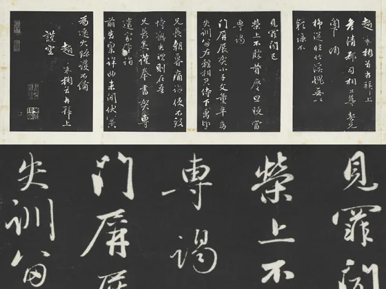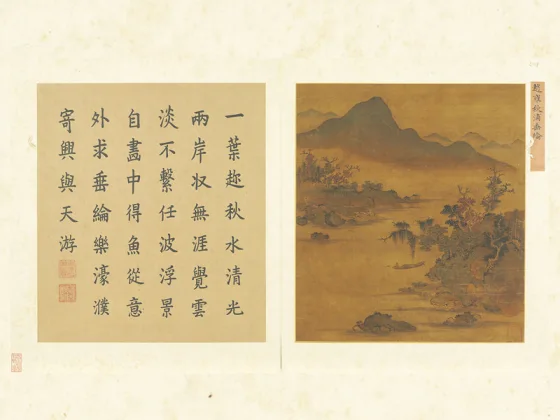 董其昌诗塘题跋:赵仲穆江山放艇图真迹,董其昌题。印记:宗伯学士、董玄宰。