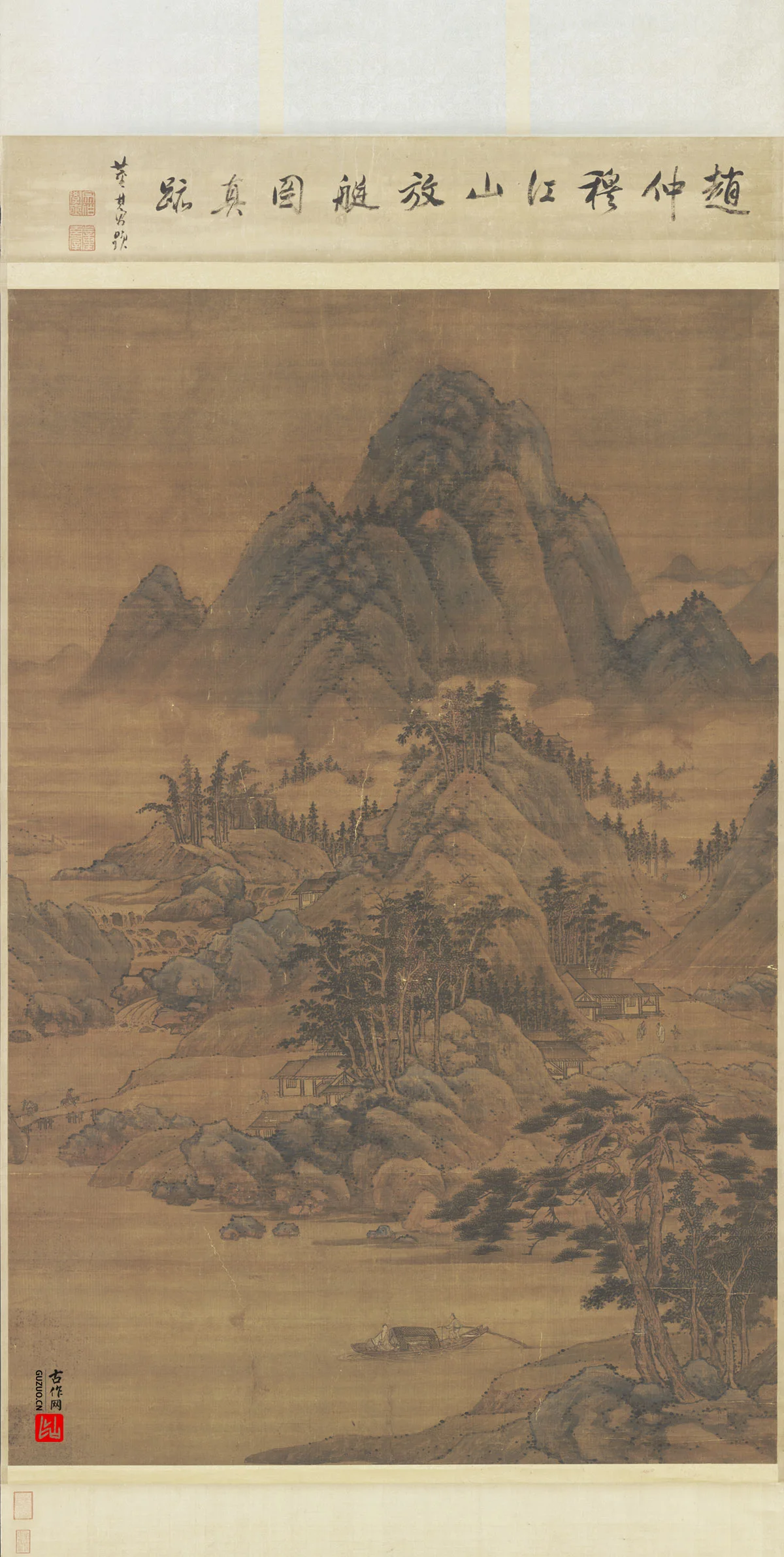 元,赵雍,江山放艇图,轴,本幅160.6x104.9 CM、诗塘17.3x104.6 CM,本幅:绢、诗塘:绫,台北故宫博物院藏。