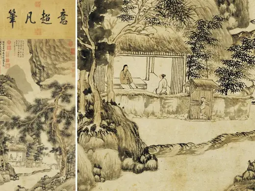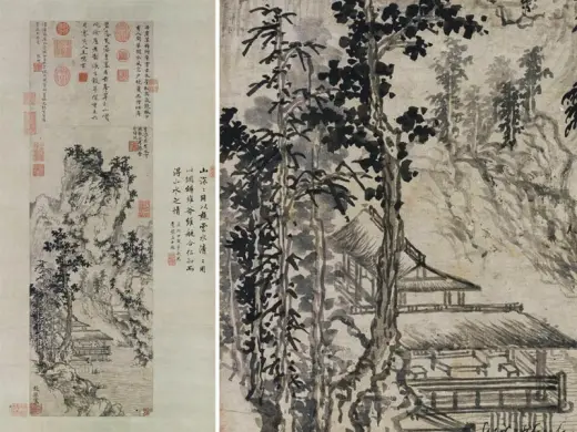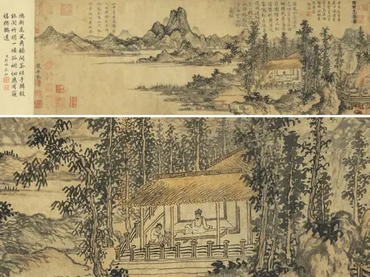 明赵原听松图,轴,赵原,明太祖洪武五年(1372年),160.7x54.2厘米,纸本,台北故宫博物院藏。听松图绘长松挺立,烟云绕绝壁,两高士对论于曲涧茅屋中。山石用董、巨之法,松树尤见笔墨功力。