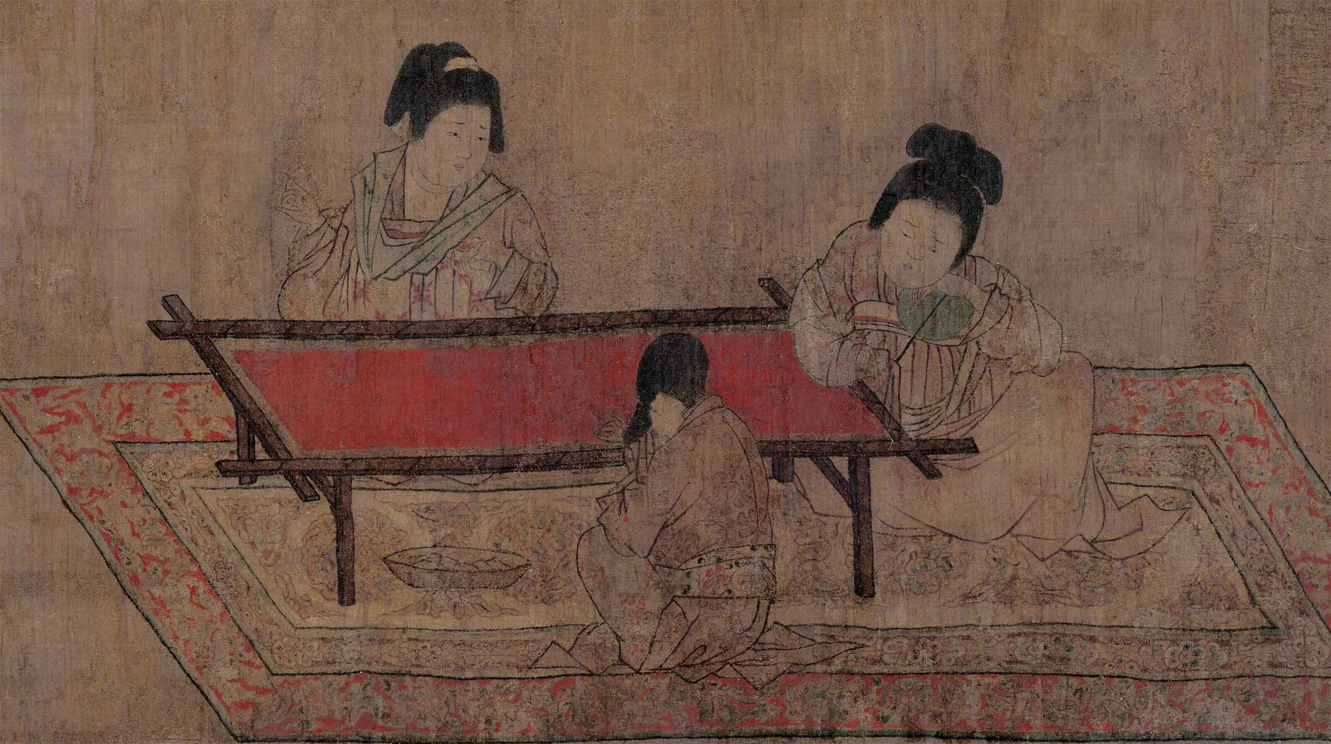 第四段为“围绣”,共3人:其中一妇女手持团扇,倚躺在绣床边,仿若有些倦态,其余两女则隔绣床对绣。