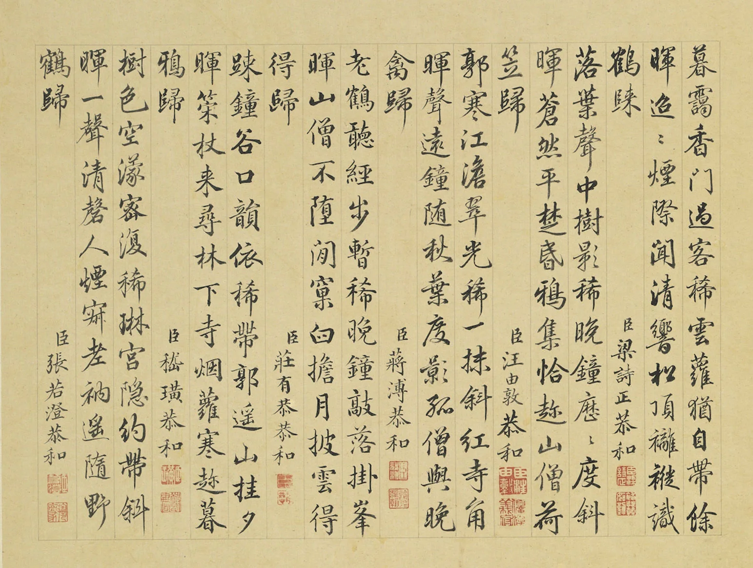 8.张若澄对幅行书题跋:树色空蒙密复稀。琳宫隐约带斜晖。一声清磬人烟寂。老衲遥随野鹤归。臣张若澄恭和。印记:臣若澄、挥豪。