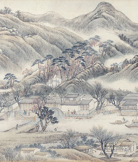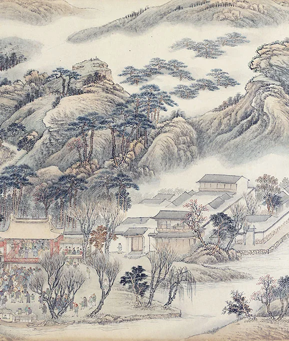 此卷为乾隆十年所进,歌颂皇帝免天下赋税,画太平盛世。村郭连绵,各行各业欢乐的生活情形。