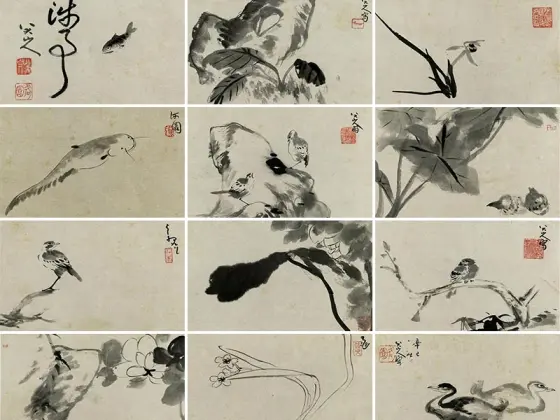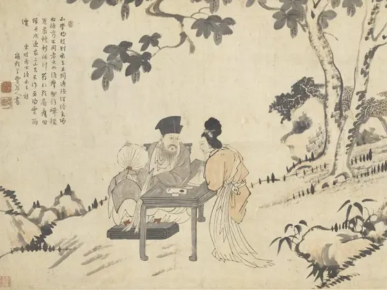 朱耷(西元一六二六—一七○五年),江西人。明宗室,甲申后为僧,号八大山人,又号雪个、人屋。能诗工书,擅山水、花鸟、竹石,笔意纵恣,不泥成法。所题「八大山人」四字,多联缀成似「哭之」或「笑之」,盖别有用意。与弘仁、石谿、石涛俗称「四僧」。 设色绘东坡做桐荫,目视朝云作书。按:朝云姓王,为钱塘名妓。苏轼官钱塘时,纳为常侍。初不识字,事轼后始学书,后轼贬惠州,家奴皆散去,独朝云相依。