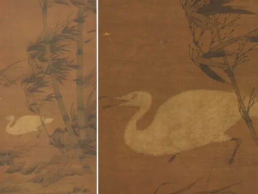 这幅画中,翠竹下的水草在微风中轻轻飘动,小浪轻轻地荡漾着。一只白鹭逆流而行,迎着风低低前进,使形态充满活力。画家用刚劲挺拔的笔触描绘竹秆、竹叶和芦苇。然而,为了勾勒出白鹭的轮廓,他使用了像丝线一样细的线条,并用它们精致地“编织”羽毛。