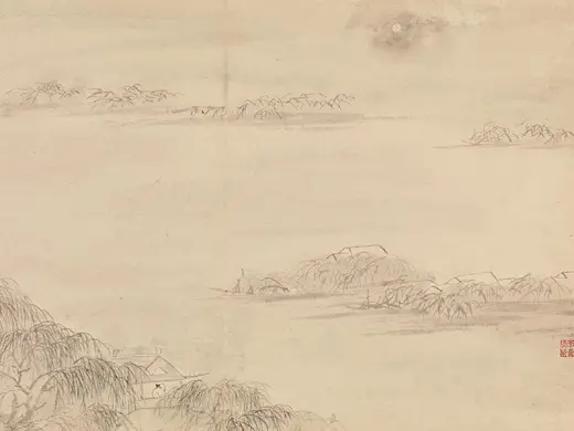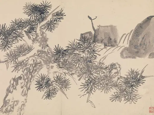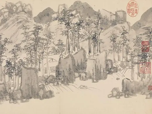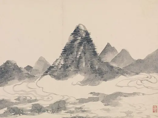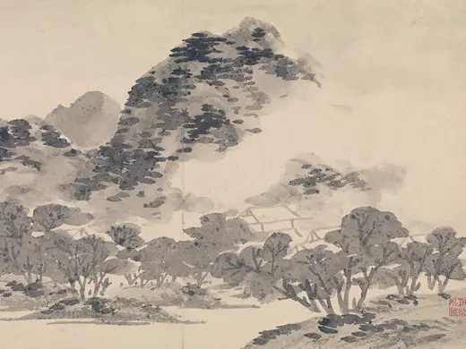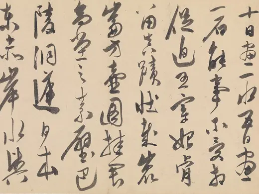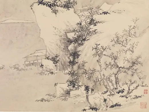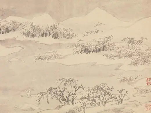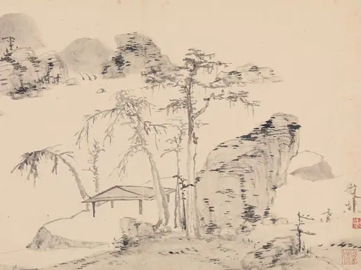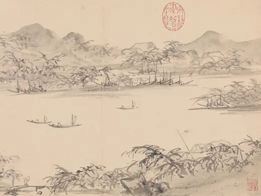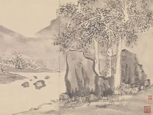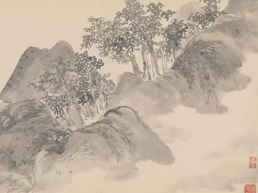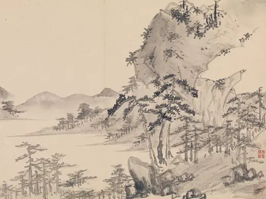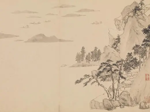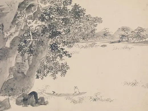 十日畫一水。五日畫一石。能事不受相促迫。王宰始肯留真蹟。壯哉崑崙方壼圖。挂君高堂之素壁。巴陵洞庭日本東。赤岸水與銀河通。中有雲氣隨飛龍。舟人漁子入浦漵。山木盡亞洪濤風。尤工遠勢古莫比。只尺應須論萬里。焉得并州快剪刀。剪取吳淞半江水。款。庚子(一五四0年)秋孟望後。偶得素冊。作墨染十四幅。尚欲寄(寄字點去)繼興。以時事適擾。遂中止。乃檢少陵之作。曳之冊末。復志此數語。以寄社中一笑。道復復甫。