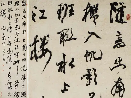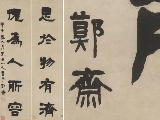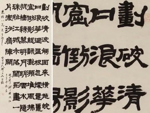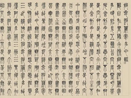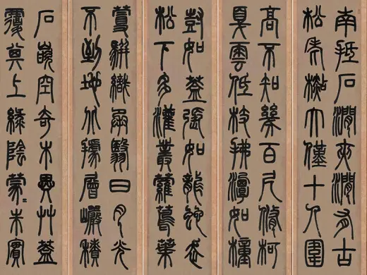 清,邓石如,篆书心经,38x88 厘米。邓石如的篆书纵横捭阖,字体微方,接近秦汉瓦当和汉碑额。他以隶法作篆,突破了千年来玉筯篆的樊篱,富有创造性地将隶书笔法糅合其中,大胆地用长锋软毫,提按起伏,大大丰富了篆书的用笔,特别是晚年的篆书,线条圆涩厚重,雄浑苍茫,臻于化境,开创了清人篆书的典型。