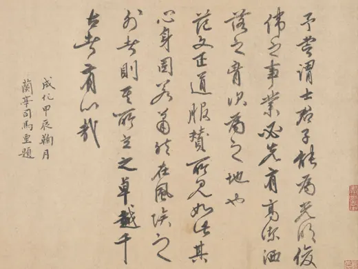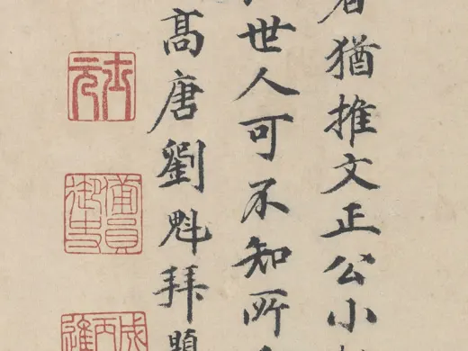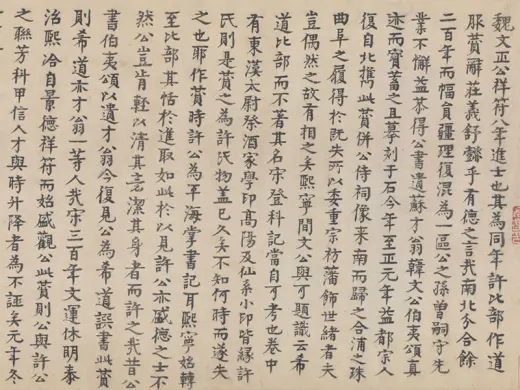这篇题交代了《道服赞》的流传顺序。《道服赞》写成后由怀庆许氏收藏,后来流入金国内府,元朝时归山东青州(古代称益都)范氏收藏。乾隆记录了元之后的流传情况,他说,元至正元年青州范氏把《道服赞》带到了苏州范氏义庄,清代大收藏家宋荦在范家见过此帖,明朝的吴宽等人也在范家见过,后来此帖归梁清标收藏,后又归安歧收藏,安歧去世后他的子孙未能守住家业,很多藏品被卖掉,其中的一部分被清内府收藏。