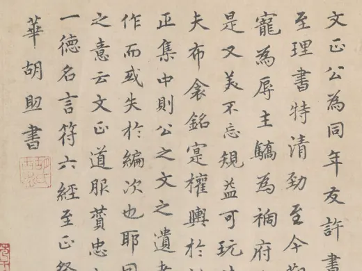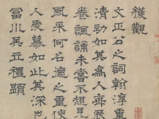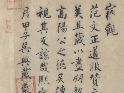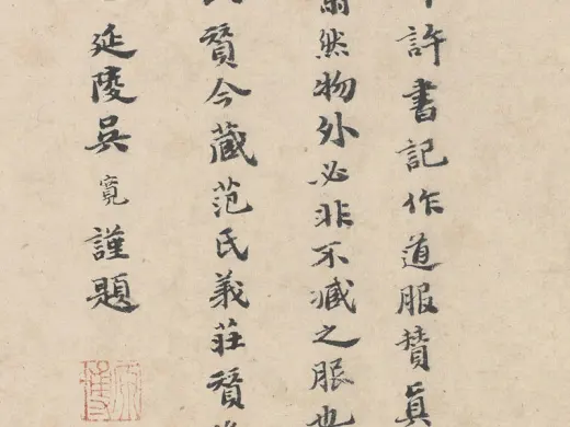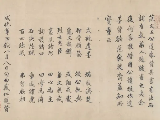 ——董诰行楷书《范仲淹道服赞卷》的引首题记,跋文书体:行楷书。范仲淹《道服赞》卷现藏于北京故宫博物院。