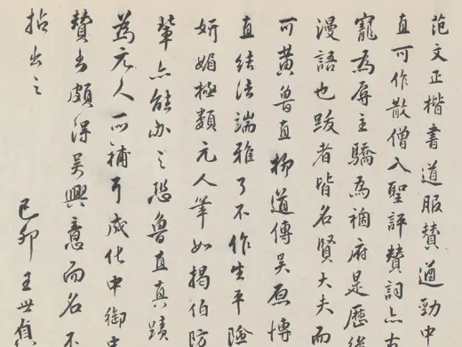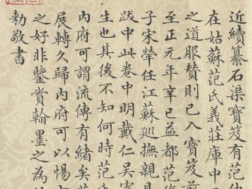 近续纂《石渠宝笈》,有范仲淹二札卷。董其昌跋云:文正公《伯夷颂》、《道服赞》二书在姑苏范氏义庄库中。因思乙酉南巡时,范氏子孙曾以《伯夷颂》呈览,题而归之。道服赞则已入宝笈前编,因取此卷谛观旁证,不特董其昌时为然,盖自元至正元年辛巳,益都范复始自北携此卷归义庄库,至我朝康熙三十五年丙子,宋荦任江苏巡抚,亲见义庄库藏墨迹九种,一为《道服赞》,见荦所作《伯夷颂》跋中。此卷中明戴仁、吴宽跋皆云在范氏,而收藏印若元理左胜皆范氏奉祀生也。其后,不知何时范氏失之,乃归安氏。洎乾隆甲子前纂宝笈,则此卷久在内府,可谓流传有绪矣。范氏义庄之《伯夷颂》尚能保其先泽,而此卷独不能保,展转久归内府,可以惕守器之难,而予既题《伯夷颂》又藏《道服赞》,凡以寄缁衣之好非鉴赏翰墨之为,仲淹亦可快然无憾矣。