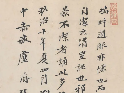 《道服赞》卷,宋,范仲淹书,纸本,手卷,纵34.8厘米,横47.9厘米。楷书8行。 此帖是范仲淹为同年友人“平海书记许兄”所制道服撰写的一篇赞文,称友人制道服乃“清其意而洁其身”之举...【详情】