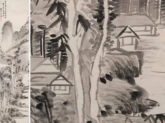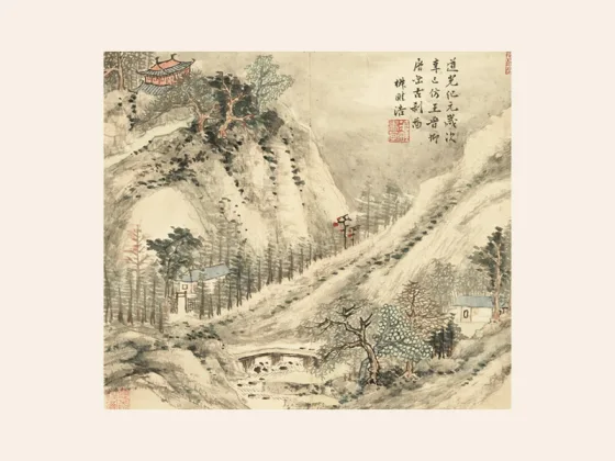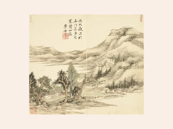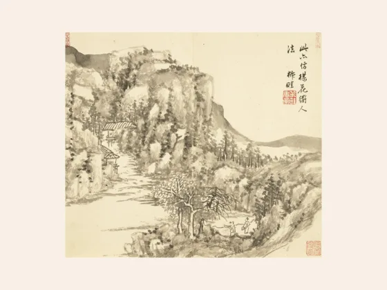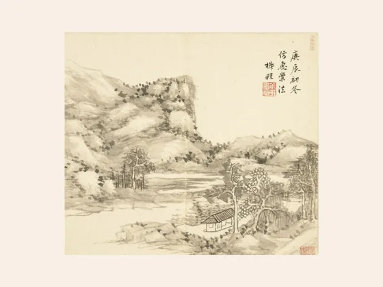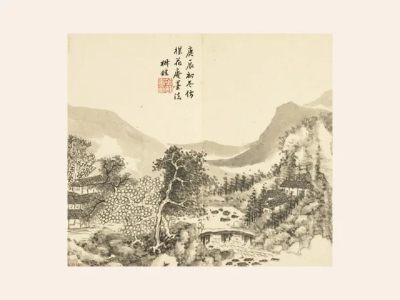 玉峰王孝廉椒畦先生画。自辟蹊径。极苍莽之致。所谓大胆落笔。细心收拾者也。此册为伯谦太史收藏。得借临一过。并志数语于尾。庚寅(公园一八九0年)四月下浒。顾沄。