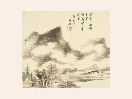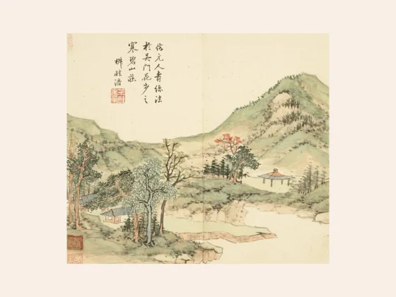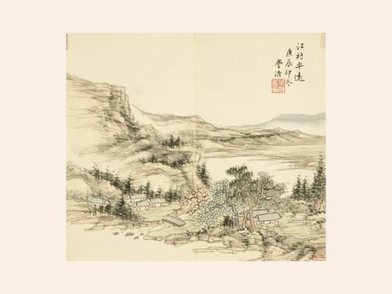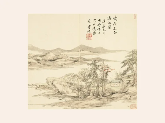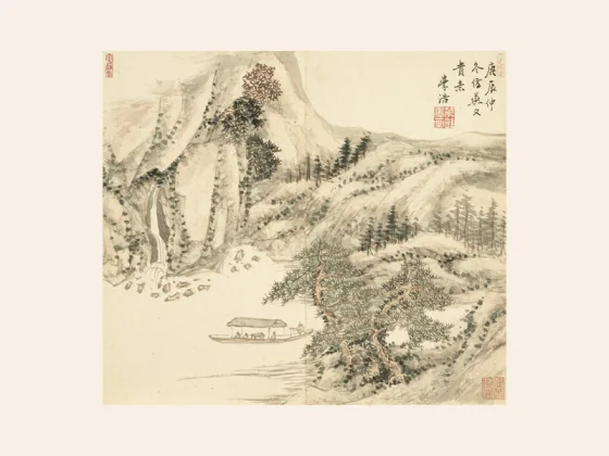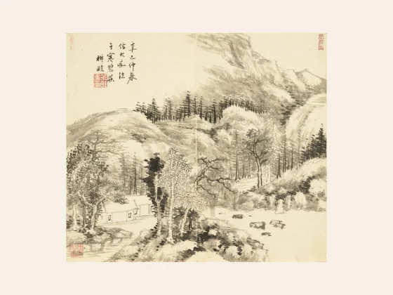 玉峰王孝廉茮畦先生畫。自闢蹊逕。極蒼莽之致。所謂大膽落筆。細心收拾者也。此冊為伯謙太史收藏。得借臨一過。并誌數語于尾。庚寅(公园一八九0年)四月下滸。顧澐。