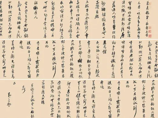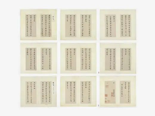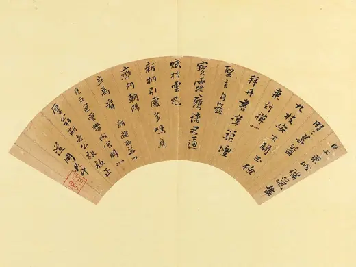 此帧为「明人便面书扇册」第十九幅,行楷书七言律诗一首。本幅笔法由锺繇变化而来,但略带隶意,方劲峭厉,别具一格。
