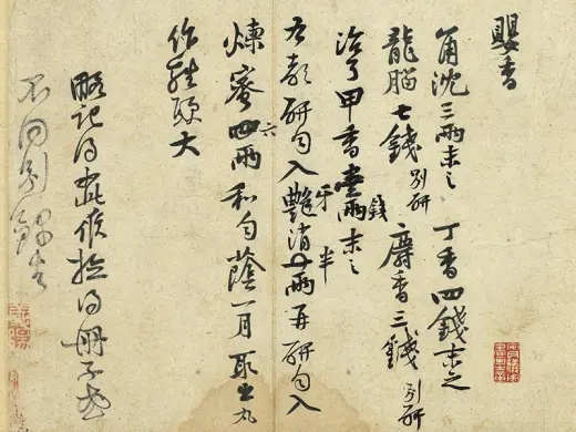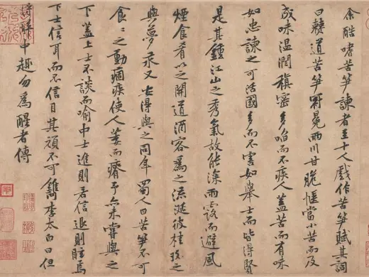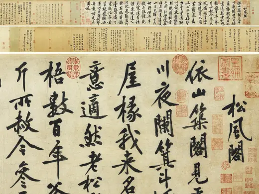 ——黄庭坚在《范仲淹道服赞卷》卷后的小楷书书法题跋,跋文书体:楷书,纸本,范仲淹《道服赞》卷现藏于北京故宫博物院。