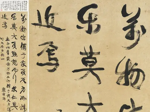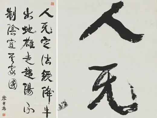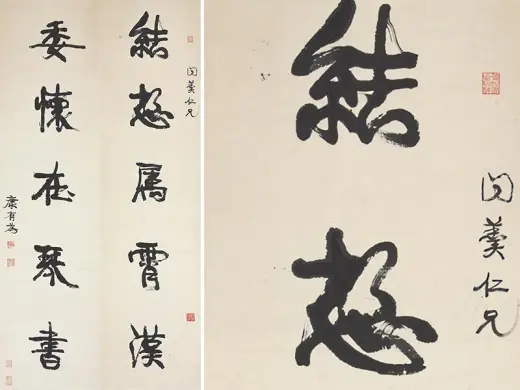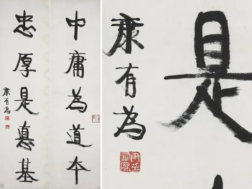 清康有为行书五言联,轴,二轴,康有为,行书,本幅174x38.7厘米;全幅180.8x45.8厘米,纸本,台北故宫博物院藏。此轴结体舒张,取北碑之方硬,用行书中锋之笔法,顿挫有力,而转折多圆,显现出恢宏的气势。书体阔势宽,平正端正,中宫紧收,下部疏散,结体疏密得宜,书风浑厚雄放,大气磅礴,酣畅淋之。
