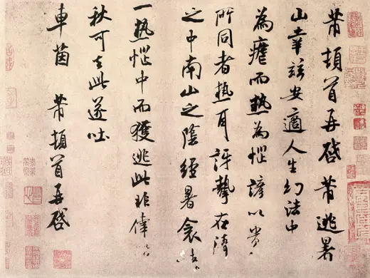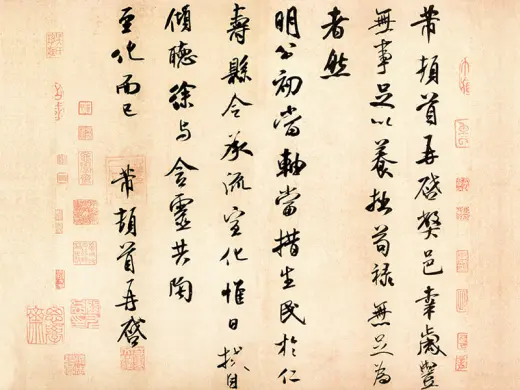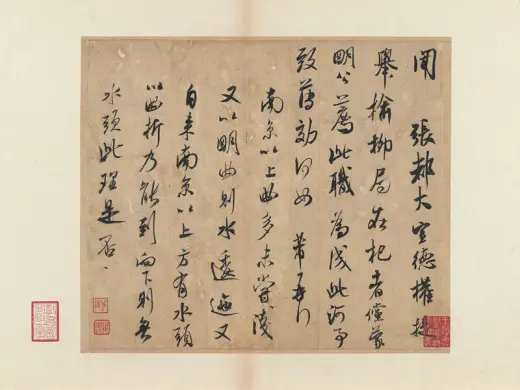 此札约书于1092年,系致友人刘季孙(933-1092),谈论书帖文玩交易之事。全帖虽然文字简短,却有明显的运笔与情绪的转换,在以行书为主的书写中,参入草书,丰富笔画的繁简与速度的变化。最后第二行「芾顿首再拜」五字连续顿挫,极富韵律,表现了洒脱不羁的个性。