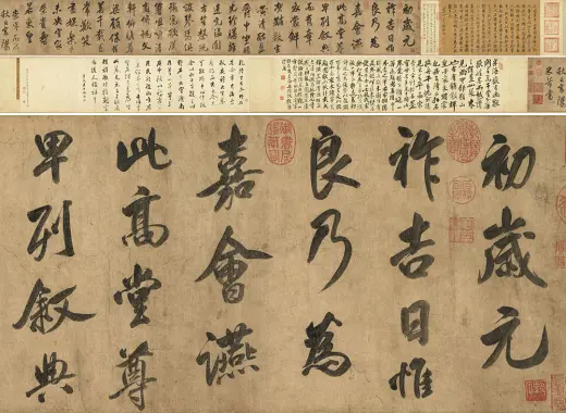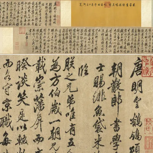 米芾,湖北襄阳人。字元章,号鹿门居士、襄阳漫士、米南宫等。为人倜傥不羁,世称米颠。官至礼部员外郎,忠言弹劾,罢知淮阳军,翌年卒于淮阳任所。 米芾生平以书自负,自道师承,于古之名迹无不学。要之,终以二王、颜真卿为骨干。苏轼称其书「迈往凌云之气,清雄绝世之文」。黄庭坚跋米书云:「余尝评元章书,如快剑斫阵,强弩射千里,所当穿彻,书家笔势,亦穷于此。」