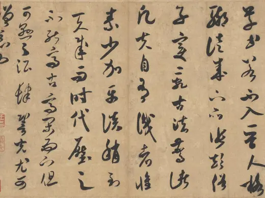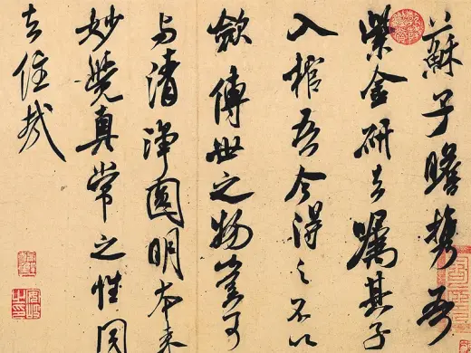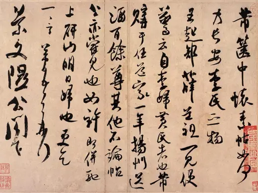 此帖运笔迅速,中锋运笔,转折遒劲,露锋尖利,风骨超逸,气韵俊迈豪放而潇洒自如,将沈著痛快的米家书法特色表露无遗。