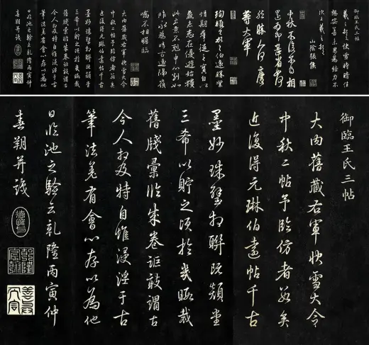 御臨王氏三帖。(楷書)。 (王羲之快雪時晴帖)羲之頓首。快雪時晴。佳想安善。未果為結。力不次。王羲之頓首。山陰張侯。(行書)。 (王獻之中秋帖)中秋不復。不得相還。為即甚省如何。然勝人何慶等大軍。(行草書)。 (王珣伯遠帖)珣頓首頓首。伯遠。勝業情期。羣從之寶。自以羸患。志在優遊。始獲此出。意不剋申。心別如昨。永為疇古。遠隔嶺嶠。不相瞻臨。(行書)。 大內舊藏右軍快雪。大今。中秋二帖。予臨仿者數矣。近復得元琳伯遠帖。千古墨妙。珠璧相聯。既顏堂三希以貯之。頃於幾暇。裁舊牋。彙臨成卷。詎敢謂古今人相及。特自惟浸淫于古。筆法差有會心。存以為他日臨池之驗云。乾隆丙寅(一七四六年)仲春朔并識。(行書)。.
