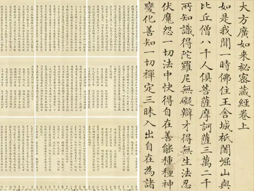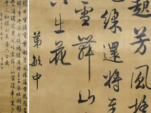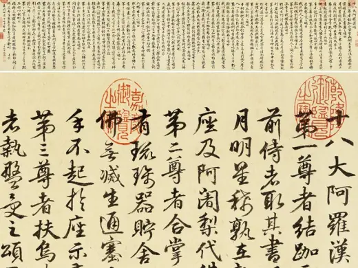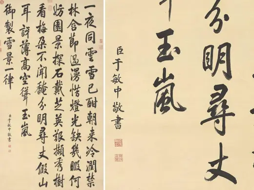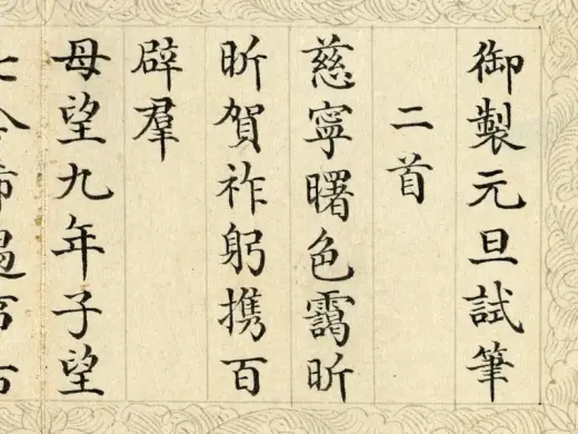 御製元旦試筆二首。(第一則)慈寧曙色靄昕昕。賀祚躬攜百辟羣。母望九年子望七。今希遇事古希聞。椒花自獻祥圖頌。鼎篆旋成壽字文。屈指元正經四度。重循慶典倍虔欣。(第二則)六街響卜是宮音。(史記天官書云。正旦聽都邑人民之聲。聲宮則歲善吉。今元旦嚮晨。聽街市人聲浩浩。宮音正應定叶祥占)。金殿曈曨初旭臨。袞袞來王稡鶼鰈。夔夔恭己會纓簪。考圖原自幅員廣。負扆不期歲月深。增一年多增一懼。始勤終怠敢萌心。(于敏中跋)穰金獻歲。酒漿諳留熟之徵。吉戊迎元。稼穡稔作甘之兆。矧臘裡。雪餘盈尺。鵲觀祥凝。值春來。風過初番。烏竿條協。爾其夜纔嚮丙已。御宵衣籌。甫傳寅旋排夙駕。既展儀於堂廟。吉輿猶導明鐙。待賀祚於庭闈。溫室徐供暖硯。乃掞丹毫而乍試。遂舒瑤檢以頻揮。韻叶文明。兼喻舜琴解阜。言宣華始。載賡唐律沖和。惟七旬正。奉九旬迓慈釐而京垓積策。計今度再經四度。循慶典而衢巷臚懽。時則金殿旭臨。鼎篆融成壽字。蘭街雲集。市聲諧是宮音。勳績煥而筰定駹。從遠近徼偕來蛾伏。幅員廣而鶼呈鰈。至新舊藩群效鳧趨。仰扆圖之。歲月益深。恭己與勤民日切。欽椒頌之。篇章肇啟。對時並紀事常新。臣誦稿增欣。繕函竊喜。譬之纖塵附嶽。曾無裨助於崇嶐。儗以寸管窺天。詎足形容其高大。乾隆丁酉(一七七七年)新正上澣臣于敏中敬書恭跋。