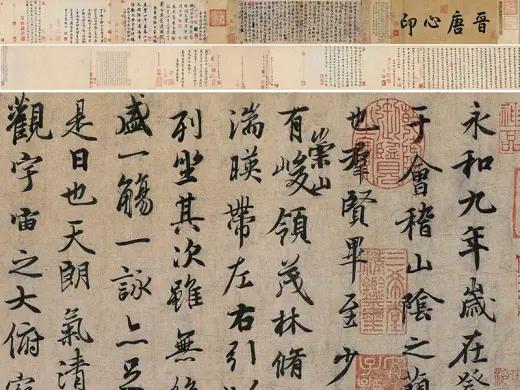 唐馮承素書。(楷書)。永和九年。歲在癸丑。暮春之初。會于會稽山陰之蘭亭。脩稧事也。羣賢畢至。少長咸集。此地有崇山峻領。茂林脩竹。又有清流激湍。暎帶左右。引以為流觴曲水。列坐其次。雖無絲竹管弦之盛。一觴一詠。亦足以暢叙幽情。是日也。天朗氣清。惠風和暢。仰觀宇宙之大。俯察品類之盛。所以遊目騁懷。足以極視聽之娛。信可樂也。夫人之相與。俯仰一世。或取諸懷抱。悟言一室之内。或因寄所託。放浪形骸之外。雖趣舍萬殊。靜躁不同。當其欣於所遇。蹔得於已。怏然自足。不知老之將至。及其所之既惓。情隨事遷。感慨係之矣。向之所欣。俛仰之間。以為陳迹。猶不能不以之興懷。况脩短隨化。終期於盡。古人云。死生亦大矣。豈不痛哉。毎攬昔人興感之由。若合一契。未嘗不臨文嗟悼。不能喻之於懐。固知一死生為虛誕。齊彭殤為妄作。後之視今。亦由今之視昔□。悲夫。故列敘時人。錄其所述。雖世殊事異。所以興懷。其致一也。後之攬者。亦將有感於斯文。(行書)。