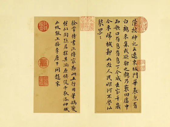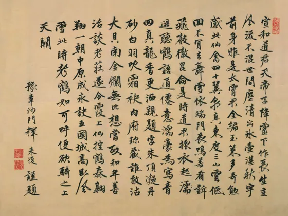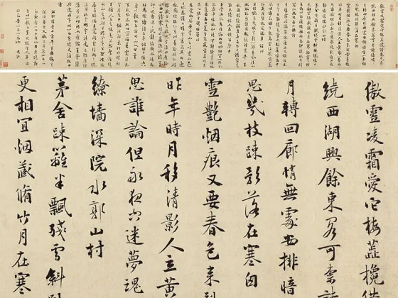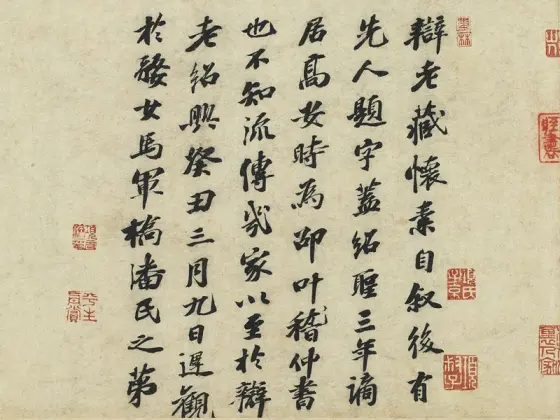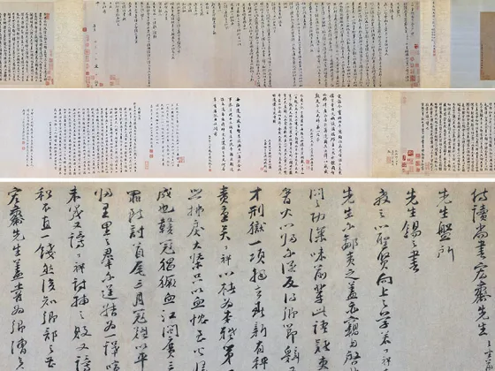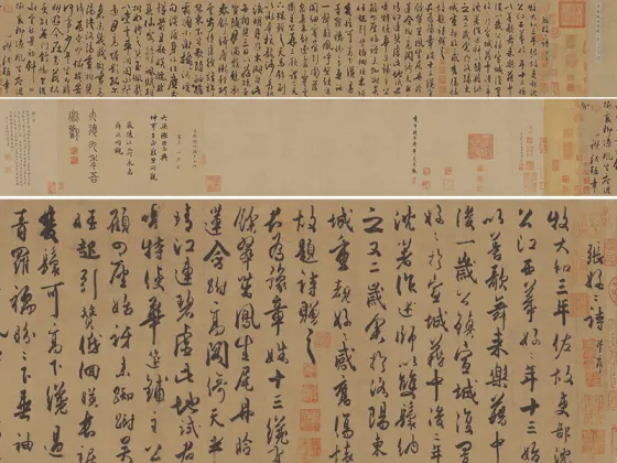 跋文:题清明易简图。清明上河事纤繁。宋臣写者张择端。宫殿桥梁及人物。舟车市肆连重关。尊卑老少男妇班。万人𧥄𧥄蜂蚁攒。须眉生动形态别。书窗摹写逾一年。可惜画图流传滞绝域。金玉陡向沙漠掷。播迁转入钤山堂。父子锋芒肆辛螫。严败旋经入内廷。寺人攫出同鬼蜮。诡云麋烂太液池。实售豪民置荆棘。灵物埋藏二百春。神光焯烁难遮匿。小臣偶得之。上呈九重内。敢将鱼目混珠光。漫取碔砆昭玉粹。题中易简二字有深思。宋代奢华异唐魏。此图深得圣人心。公正和平永康泰。干以易知。坤以简能。易简而天下之理得。圣心易象同光明。他人观图赏纤悉。圣人观图等无逸。清明易简图疏解。张择端清明画图。本有二幅。一在张英公家者。名上河图。有张着跋。一留汴京者。无跋。意即易简图也。(见吴匏庵集)。金天辅五年。即宋徽宗宣和三年。中国之物。不应遽入外邦。按宣和四年。遣童贯蔡攸助金伐辽。二人邪佞。又皆工画。时子女玉帛。皆不吝惜。安知不以此图媚金。天辅得之以赐钱妃。一时事也。金贞元二年。即金主亮。亮于图上有题字及玺。明代此图归李东阳宾之。图上有二印。又归王世贞元美亦有印。严嵩巧取豪敓。归嵩。(见历代鉴藏画家)。嵩有分宜二印。子世蕃。有东楼二印。严败。入大内。为小内臣窃出。诡云藏御沟石洞。积雨麋烂。(见书画谱)。实售与吴中吴家。今子孙不复存矣。清明上河。宋代积久豪华。择端本翰林。寓讽谏。画一年余。难矣。而转曰易。人一万余。繁矣。而转曰简。干以易知。坤以简能。包涵大易精义。外人但称上河。从其便也。咏诗之人。俱无可考。张英公本。今艺苑不传。臣学殖浅陋。家无藏书。故所见只此。臣沈德潜。年九十有六。