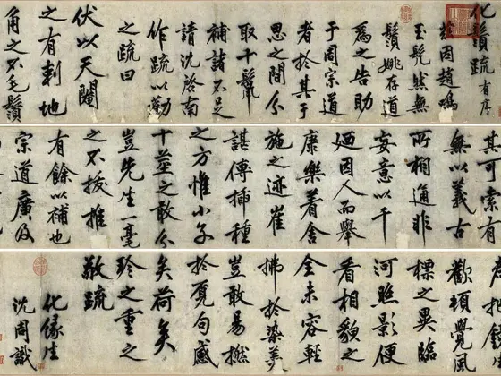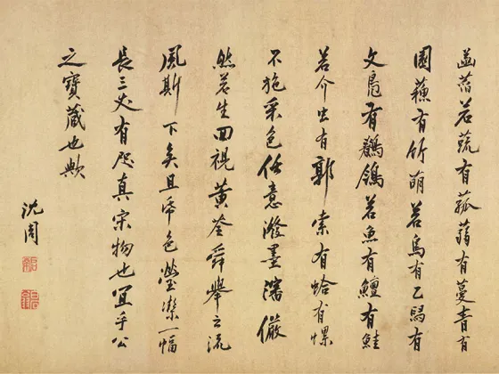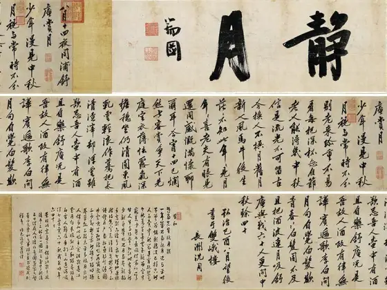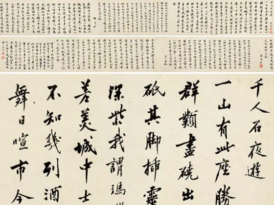 登金山。 龍宮湧出玉璘珣,乍眼來看極悚神。 滿地莫論無坐處,東坡至佛印室中曰: 「內翰來此間無坐處。」 中流真見不羈人。東坡蒜山詩云: 「金山亦是不羈人。」 牆低樹少多容月,石瘦花慳晏得春。 舟楫一江名利路,煙波誰謂不生塵。 陶公甫韋大年費崇父道士何可閒同酌吉公房一首。 常惜忙未到,到來方悟閒。 過江如隔世,入寺不知山。 風氣薄詩骨,夕陽浮醉顏。 古人誇一宿,三宿我才還。 吉公永安堂夜宿一首。 清酣散江風,展火對不寐。 澄懷入禪觀,真若超世諦。 自顧衰颯境,掛住亦良計。 江山不厭客,詩壁無曠地。 州人亦何修,舟楫日容易。 笑我雪鴻跡,天地暫為寓。 感史明古曾約同遊今已化去一首。 鬍翁久憶金焦勝,感嘅來登獨老身。 生死隔塵空舊約,江山如此欠斯人。 強留詩酒聊三日,愁送鶯花又一春。 浩蕩煙波莽回首,漫將行樂與誰論。 趙民部涵虗樓小酌有作。 白髮蕭蕭始此來,高樓正倚夕陽臺。 闌憑南面山都出,梯到上頭江大開。 自愧衰翁落遲局,未容民部不深杯。 若教却飲天應笑,豪傑眼前安在哉。 民部約遊焦山歸思浩然作此奉辭。 江勢方長海又開,倩人扶上妙高臺。 十年強健天如許,留取焦山作後來。 民部索和西涯閣老舊韻。 儘有風波怯往還,又因名勝使人攀。 天將白玉浮諸水,誰以黃金姓此山。 欲就一竿漁浩蕩,更憑雙足弄潺湲。 老僧莫作誰何問,只借中泠洗醉顔。 登妙高臺。 登臺見青草,(月永)(月永)感今昔。 江山本舊觀,形勝我新識。 江山不因臺,流峙自天闢。 臺固為江山,亦當為遊客。 往來其無窮,有得有不得。 坡老莫可呼,舉酒酹江色。 望江。 一源萬里勢成三,截地分明限北南。 長塹悠悠天所設,奔流浩浩海相函。 獨憐擊楫存遺誓,可咲囊沙是謾談。 頭白妙高方縱目,落霞孤鶩晚猶貪。 飲中泠泉。 此山有此泉,他山無此泉。 泉名與山名,並為天下傳。 山泉兩合德,珠璧輝江天。 宛在水中央,天使塵土縣。 山本一江石,泉井從石穿。 非鬼不可鑿,人莫知其源。 黝深貫龍窟,不溢亦不騫。 我久負渴心,始修一啜緣。 憑闌引小勺,氷雪流荒咽。 再灌肝與肺,化作清泠淵。 沁沁若沆瀣,逐逐空腥羶。 至味謝茗荈,亦不從烹煎。 謬哉康王谷,欲勝宜未然。 未伺鴻漸知,但飲必推先。 由我口舌得,亦獲參其玄。 世多未沾者,茫茫尚垂涎。 滿注兩大罌,載歸下江船。 搖光蕩江月,泛影雲亦鮮。 分潤及鄉人,七椀同通仙。 郭璞墓。 氣散風衝豈可居,先生埋骨理何如。 日中數莫逃兵解,世上人猶信葬書。 漂石龍涎春霧後,交沙鳥跡晚潮餘。 秪憐玉立三峰好,浮弄江心月色虛。 鶻石。 海東飛鶻力不續,就此一拳聊息足。 擎波勞怪鬼莫撼,引手近疑人可觸。 山含岈水竇候潮鳴,皴皵雲膚借苔綠。 金山只恐順江去,誰插鼇簪關地軸。 千年奇觀豈無賞,疑有坡詩刻蒼玉。 頃年遊金山,次第得詩數篇,儗托吉公呈州中諸名流,未果。□光甫來顧,出秋山□作見示,嘆服不已。遂乘便附光甫轉似□山,可竄與竄,可□和之,是所望也。光□博雅好學,於好醜自了了目中,但不屑見教耳。弘治癸亥(一五0三年)上巳日,長洲沈周。