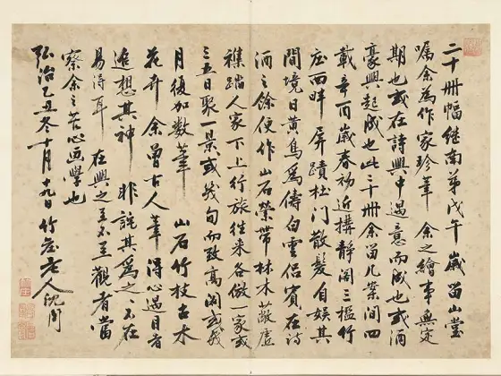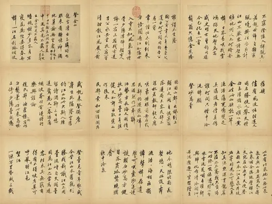 元明书翰册,沈周自书诗册,沈周,行书,明孝宗弘治十六年(1503年),一册14开(本幅14开14幅),纸本,本幅一22.7x27.3、本幅二22.7x32.7、本幅三22.7x30.8、本幅四22.5x29.2、本幅五22.7x32.9、本幅六22.5x30.5、本幅七22.7x29.6、本幅八22.7x28.8、本幅九22.7x32.1、本幅十22.7x25.8、本幅十一22.3x33.4、本幅十二22.1x27、本幅十三22.1x28、本幅十四22.1x35.9厘米,台北故宫博物院藏。