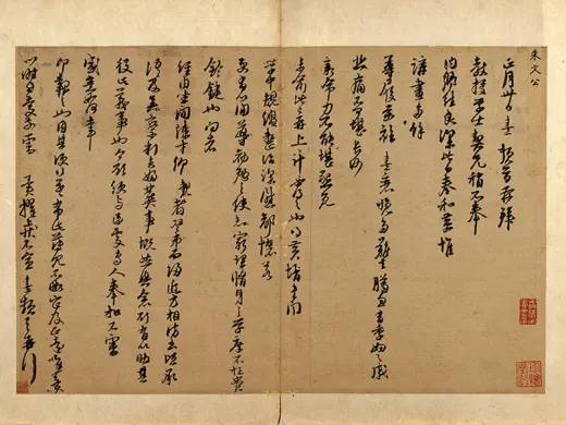 本幅十四开,是朱熹存世仅见的大字墨迹,所书为《易经》上的「系辞」,共一百零七字,经元明两代藏家之手,于清乾隆时入宫,著录于《石渠宝笈.初编》,为流传有绪之作品。此册楷书为主,笔划却是爽快有力。墨色黝黑,非常醒目。