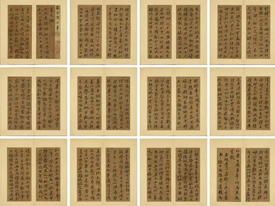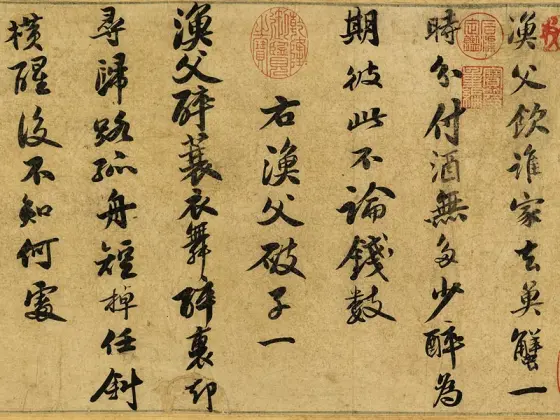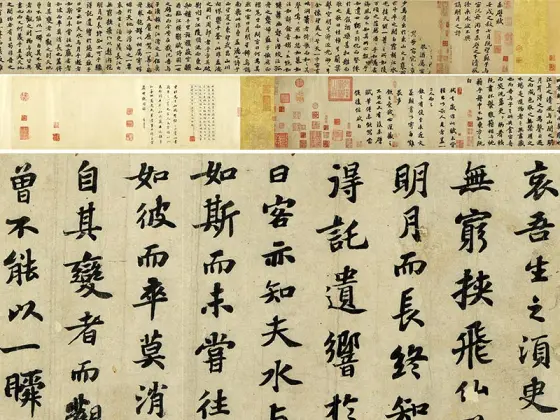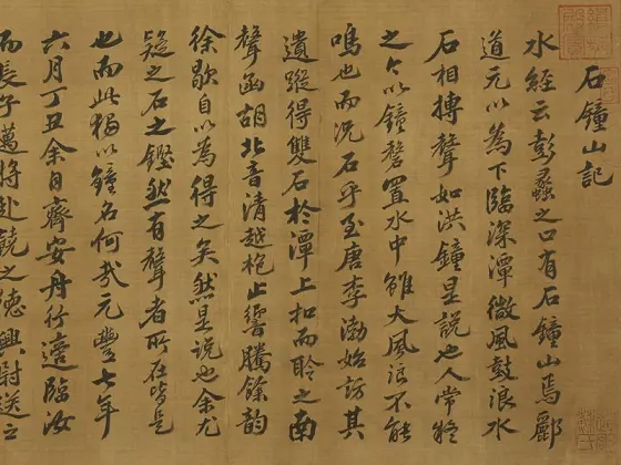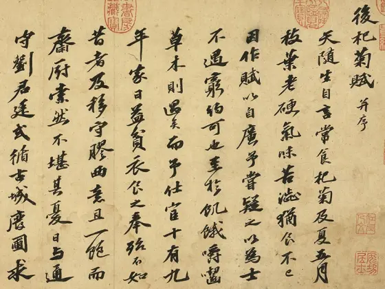 行书《洞庭春色赋》和《中山松醪赋》并后记,计六百八十四言,为其传世墨迹字数最多者。纸精墨佳,气色如新,笔法雄劲,潇洒飘逸。